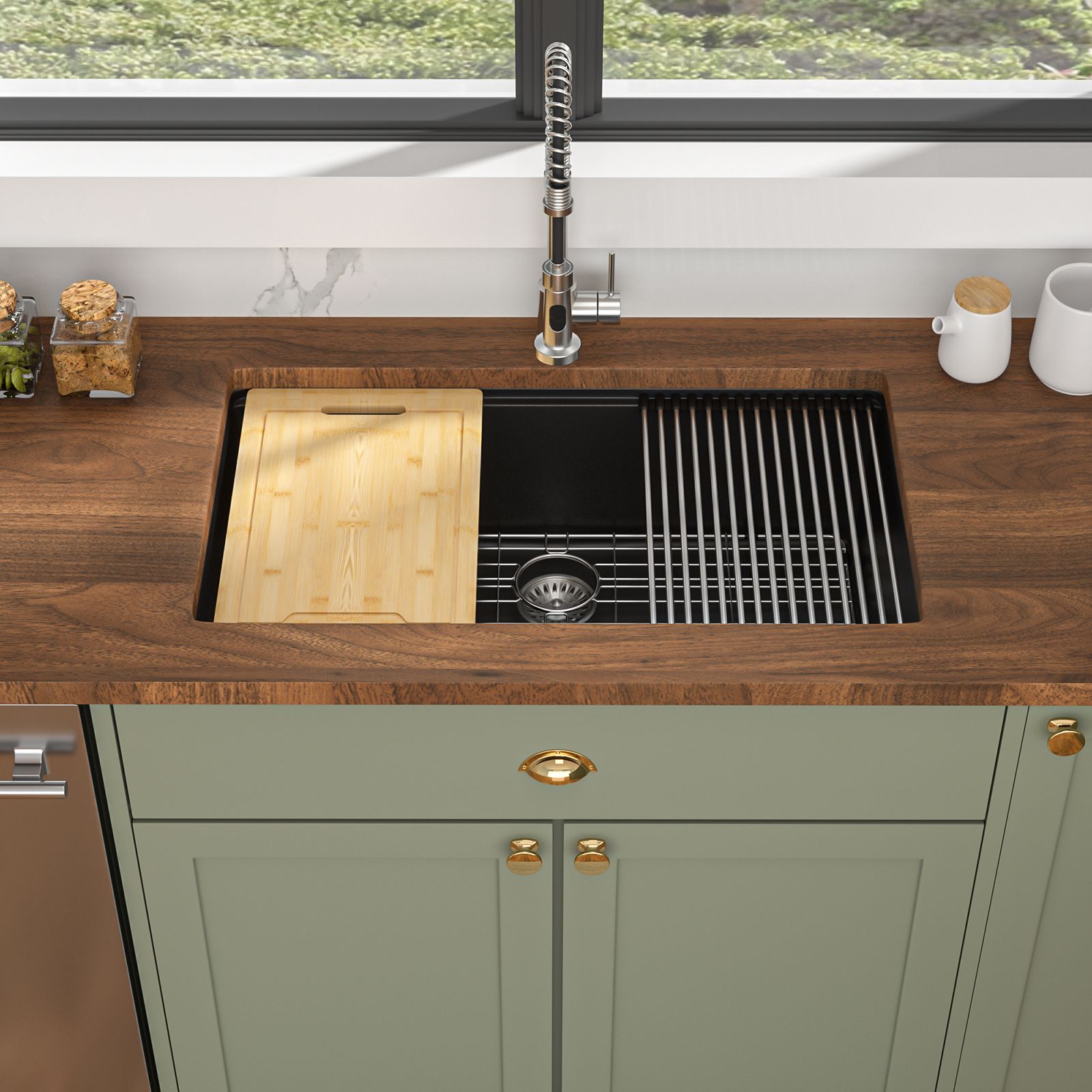 In this granite composite sink package included a black quartz kitchen sink, a drain strainer assembly set, bottom grid, roll-up drying rack and cutting board.