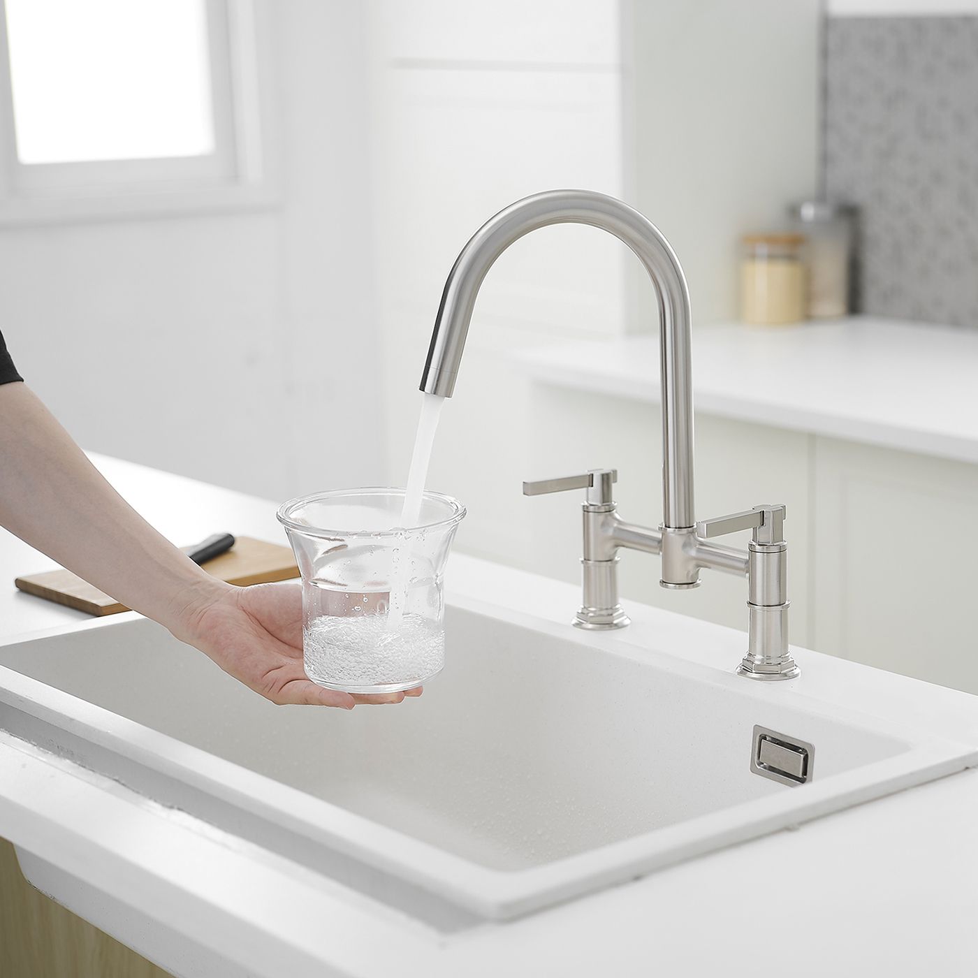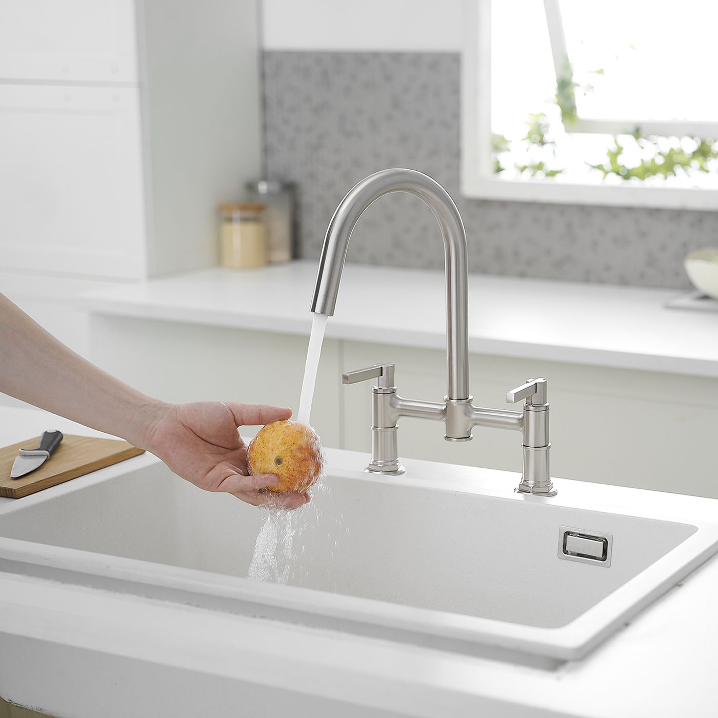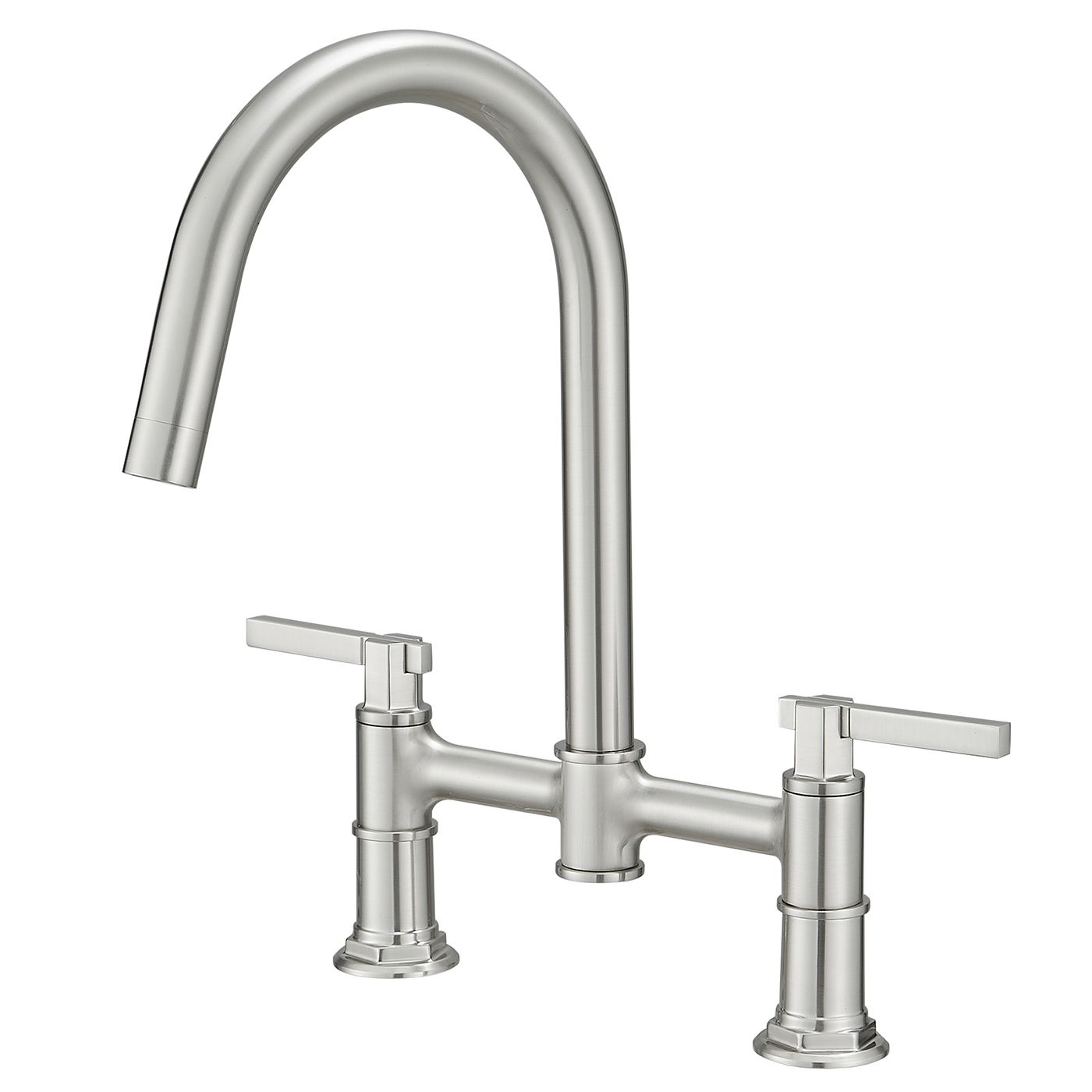 This Double Handle Bridge Kitchen Faucets has a streamlined silhouette that coordinates with any kitchen sink. 2-holes design makes installation easier This kitchen sink faucet is made with quality components in order to ensure superior performance and durability. High-arc spout can be rotated 360°.