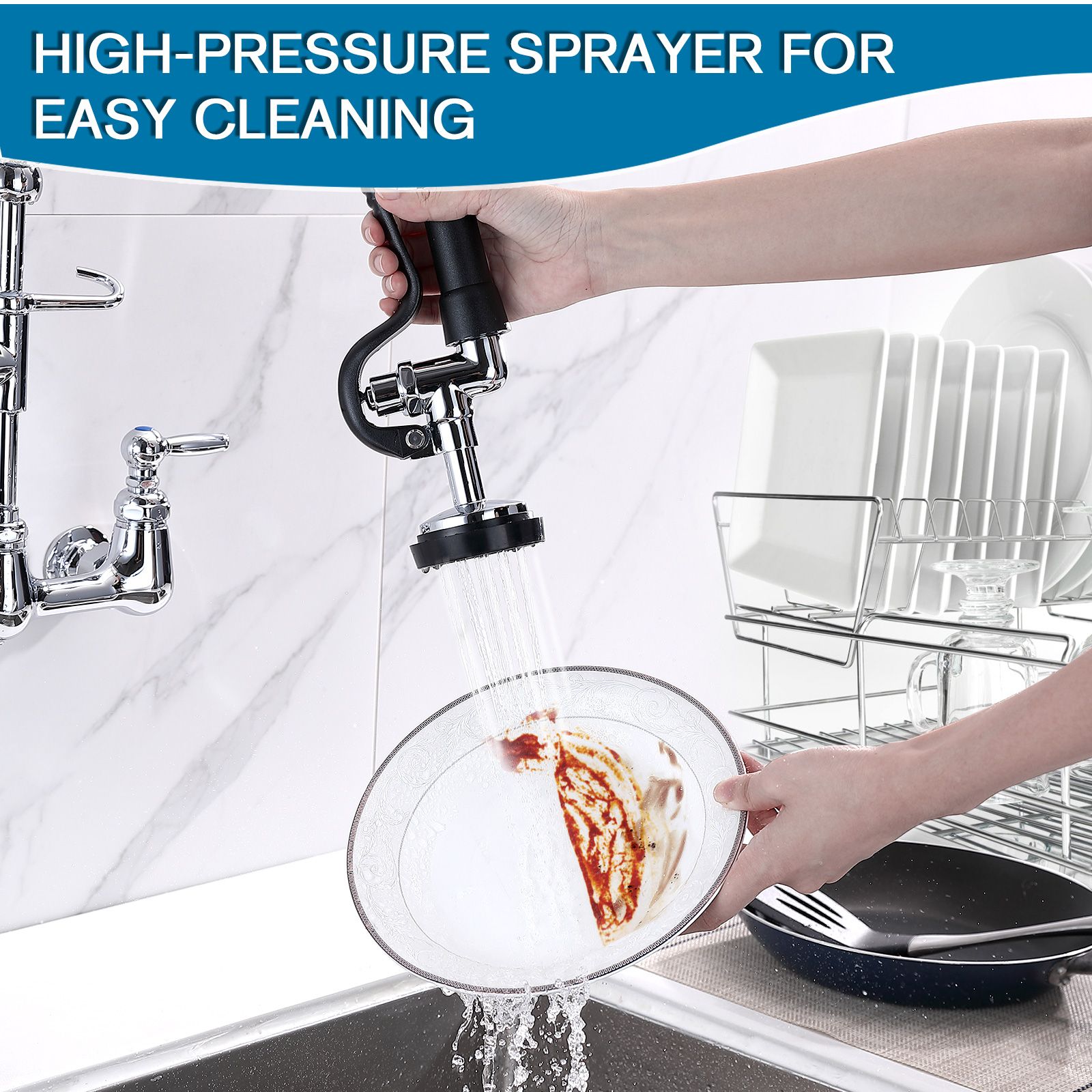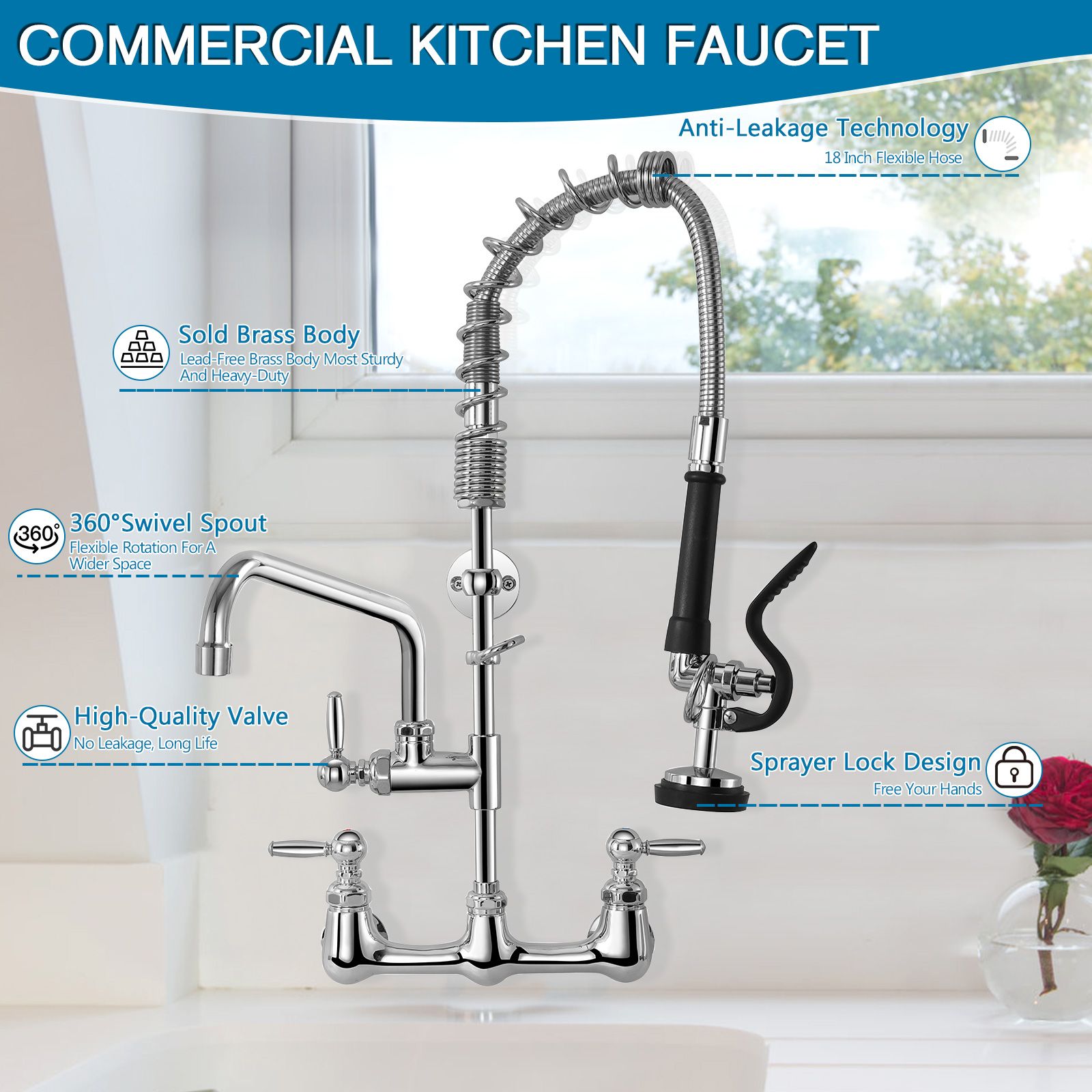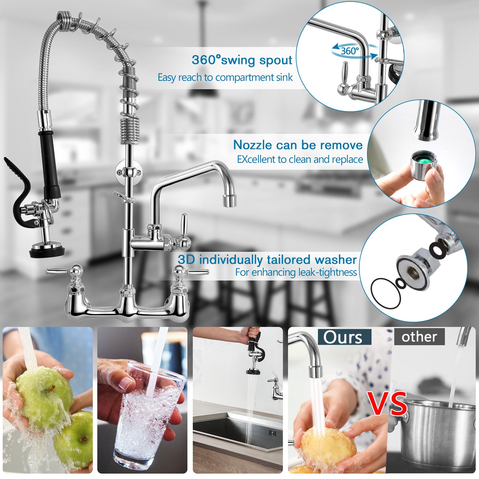 Commercial Faucet with Pre-Rinse Sprayer, 8 Inch Center Wall Mount Kitchen Faucet with Pull Down Spray, Swivel Spout for Restaurant 1-2 Compartment Si Commercial Faucet with Pre-Rinse Sprayer, 8 Inch Center Wall Mount Kitchen Faucet with Pull Down Spray, Swivel Spout for Restaurant 1-2 Compartment Si Commercial Faucet with Pre-Rinse Sprayer, 8 Inch Center Wall Mount Kitchen Faucet with Pull Down Spray, Swivel Spout for Restaurant 1-2 Compartment Si