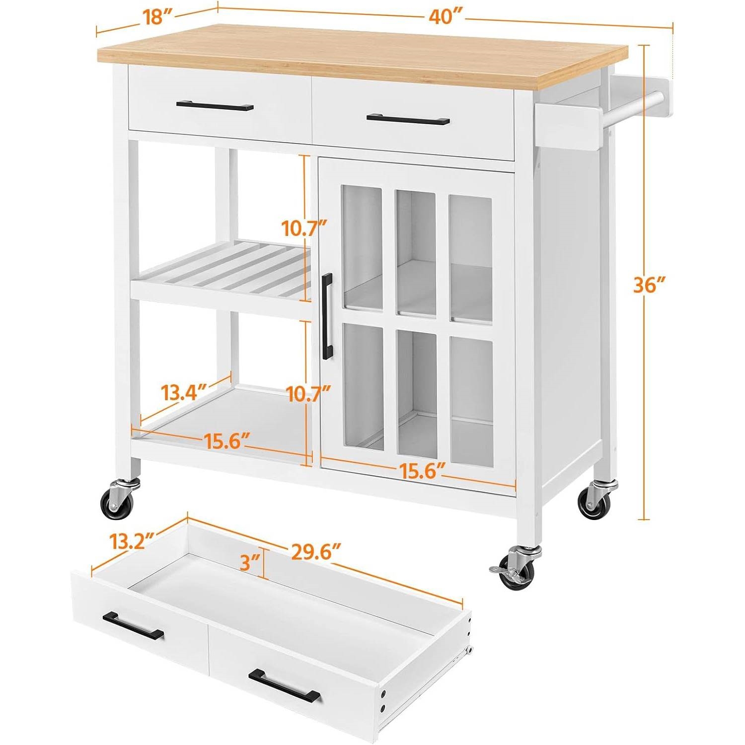 • White Kitchen Island Cart with Wood Top Storage Cabinet and Locking Casters