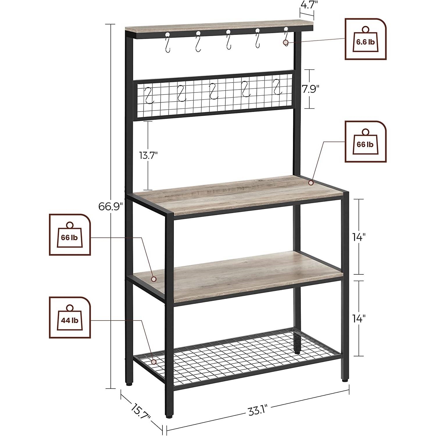 Create your insta-worthy dream kitchen with this Modern 3-Shelf Black Metal Light Grey Wood Kitchen Baker's Rack Microwave Stand. Combining an steel frame and wooden shelves, it adds uniqueness without losing the pleasant atmosphere for you to enjoy freshly baked pizza. Oven, Microwave, Coffee Machine: If all of these are essential items for you, don’t worry! Strong steel frame and quality 15 mm thick particleboard have the strength, so you can put nearly all you need on this kitchen shelf: Place pots on the 3 shelves, customize the mesh panel by hanging cups and potholders, leave ladles and spatulas on the top hooks, and use the top narrow shelf for spice jars—now it's up to you! You don’t need to an expert on the assembly of this kitchen shelf, as it comes with numbered parts and step-by-step instructions to make it easy-peasy.